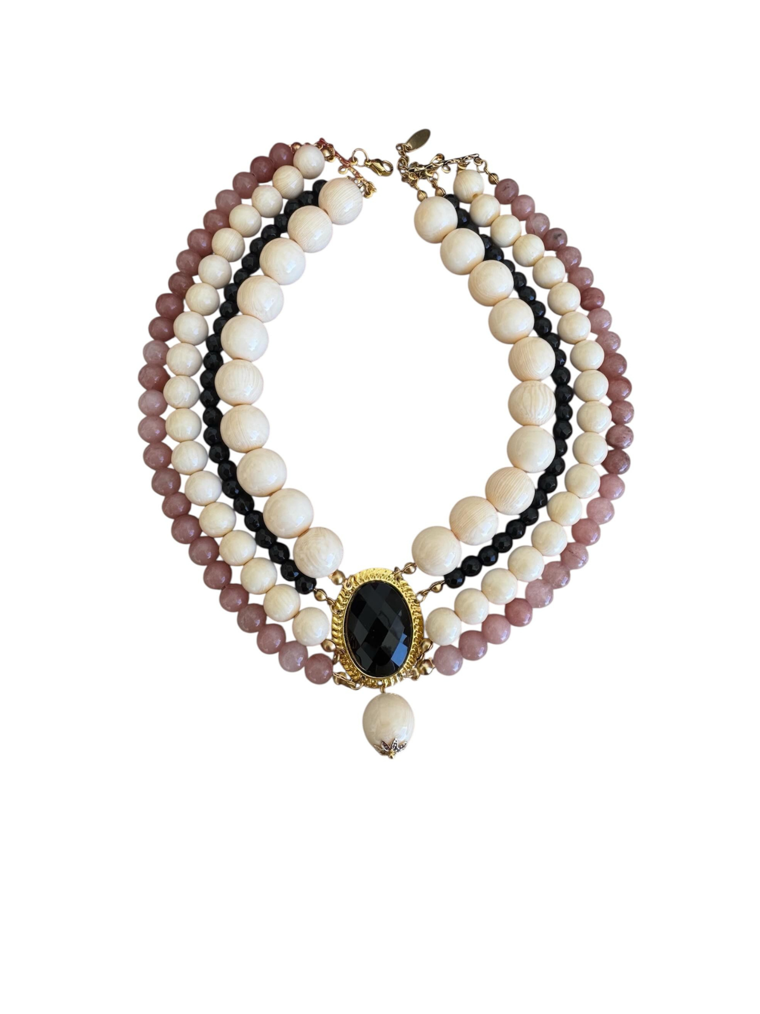 Collar tricolor con piedras de resina beig, piedras negras y piedras rosas maquillaje con cierre de acero y extensor de 7 cm.