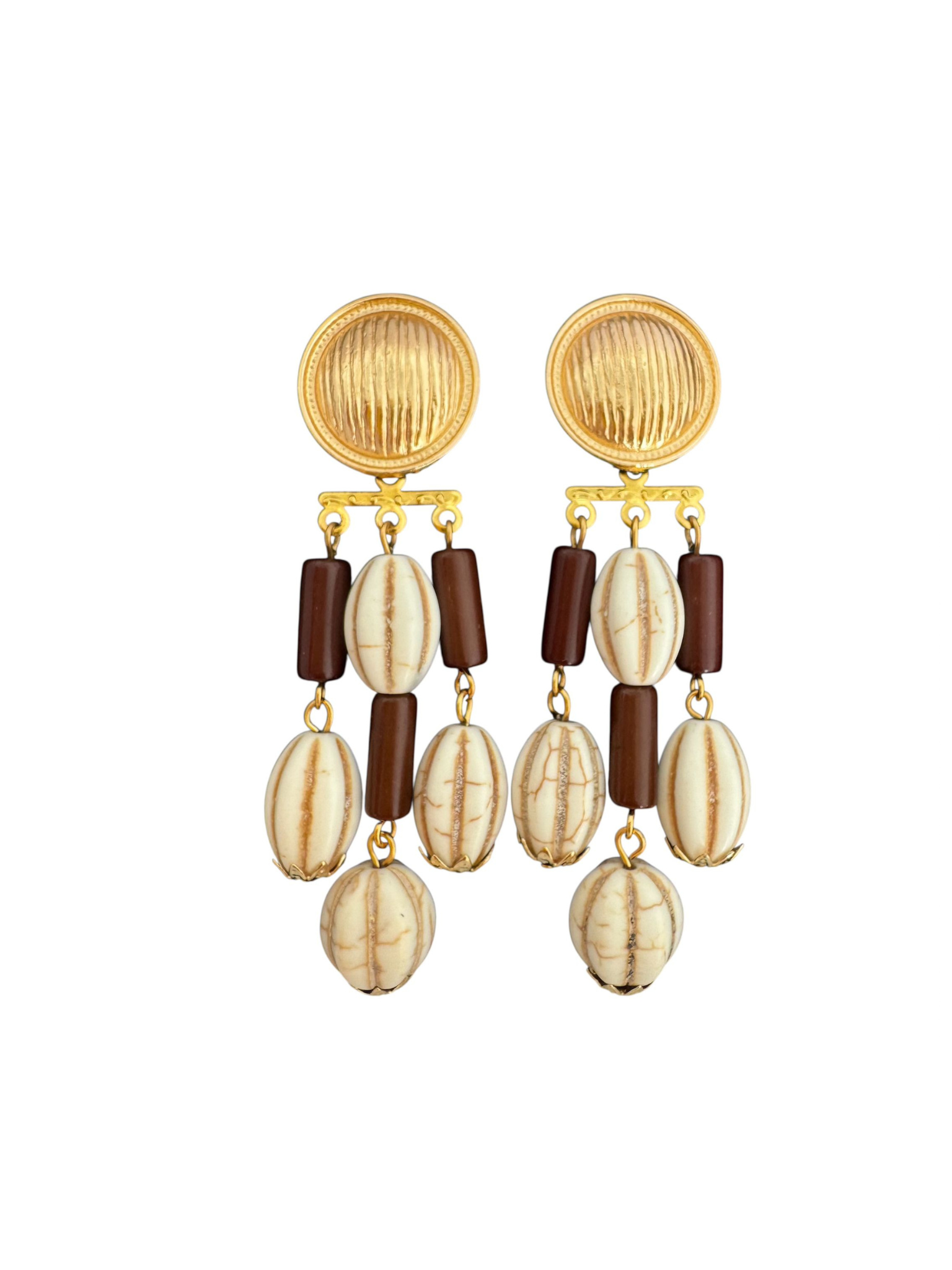 Pendientes artesanales con base dorada y piedras de resina en beige y tono tierra.