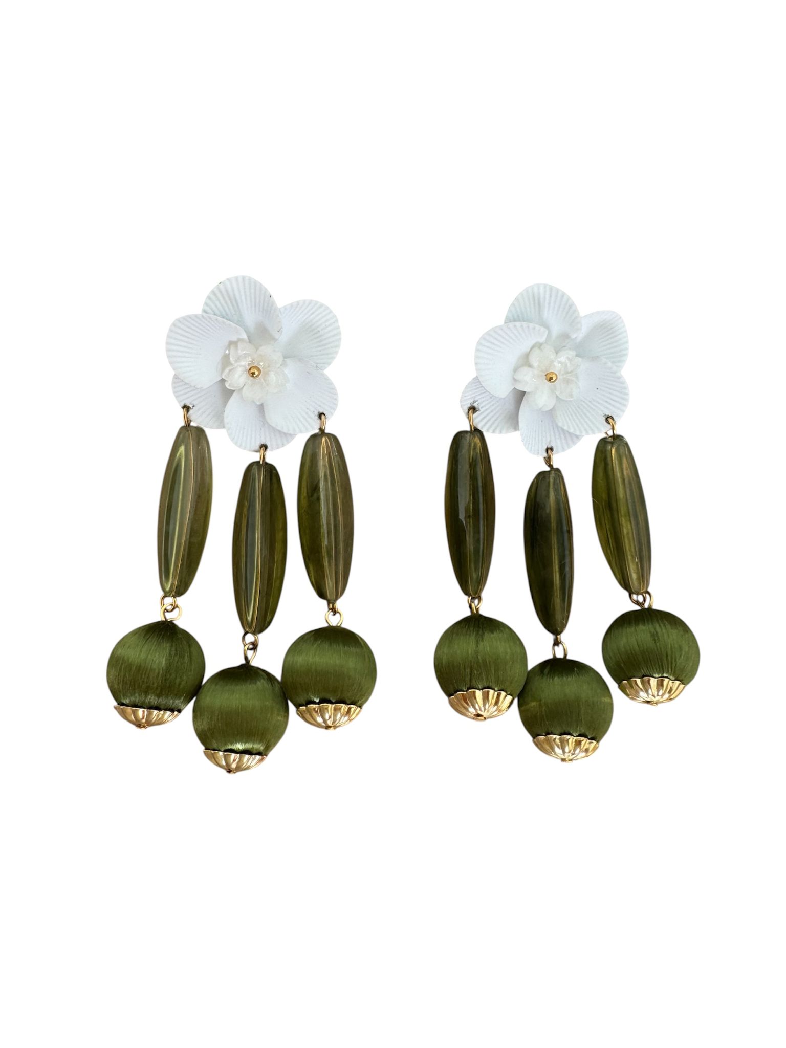 Pendientes largos de inspiración natural que combinan una delicada flor blanca y cuentas en tono verde oliva.