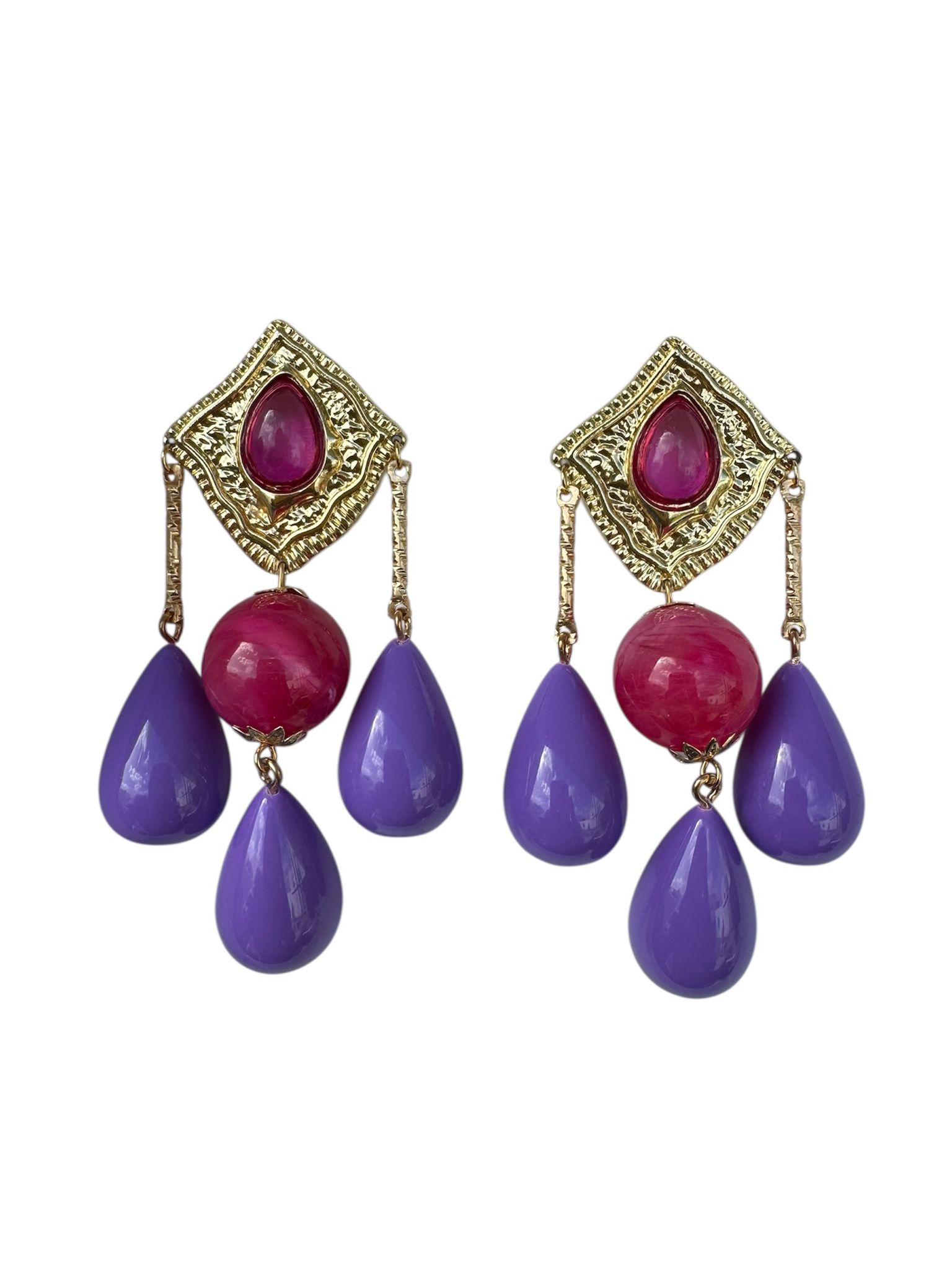 Pendientes artesanales con base dorada , bolas de resina rosa fucsia y lágrimas moradas.